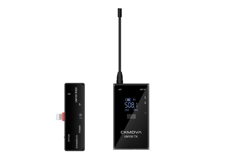 The CKMOVA UM100 Kit5 UHF Wireless Microphone is the UHF Wireless Microphone that provides high-quality sound for users in almost any scenario. The Wireless Flexible antenna supports a 50m working distance. The kit comes with one clip-on transmitter and one Lightning receiver compatible with iPhone smartphones and other iOS devices that have a Lightning input.